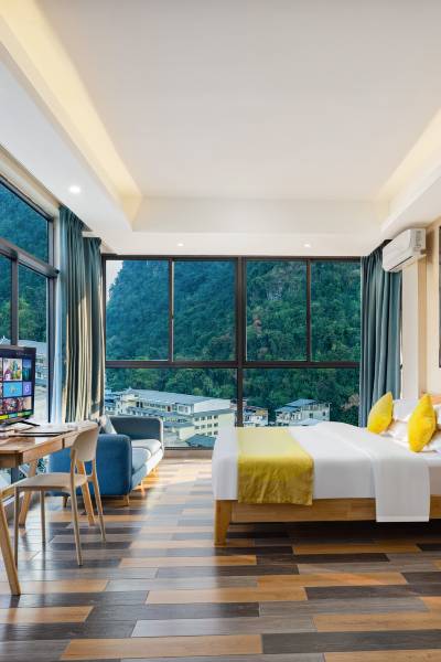 落地窗前赏山景,室内干净设施新